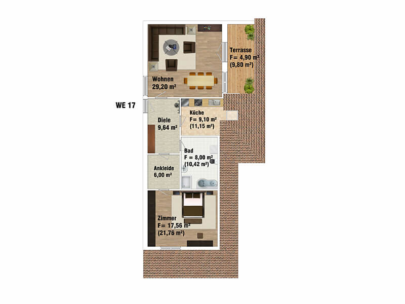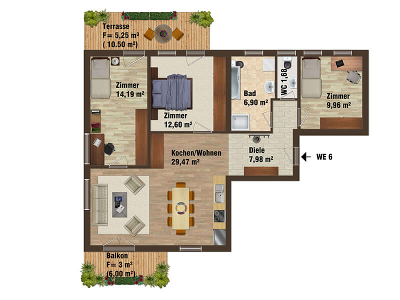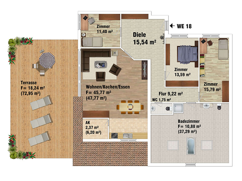 Großzügige Balkone und Dachterrassen als auch Gartenanlagen laden zum Entspannen ein.